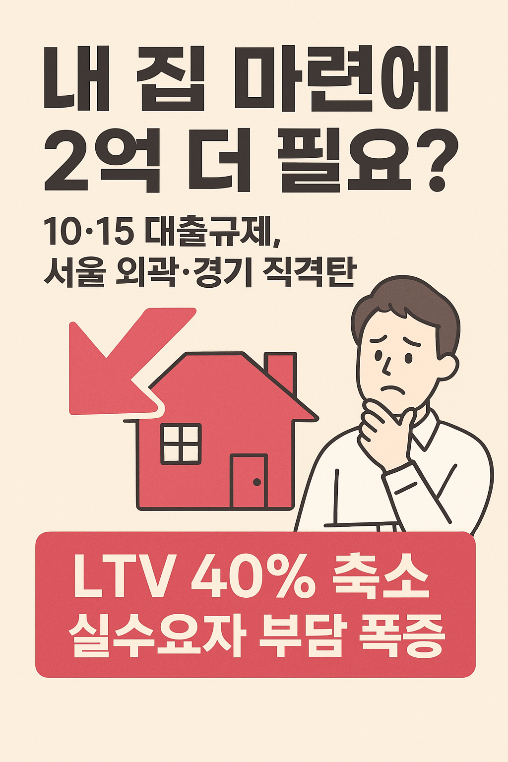 정부의 10·15 대출규제로 LTV가 70%→40%로 축소되며 내 집 마련 문턱이 높아졌습니다. 서울 외곽·경기 실수요자는 평균 2억 원 이상 자금이 추가로 필요합니다. 부동산 대출규제 4심 정리와 대응 전략을 확인하세요.